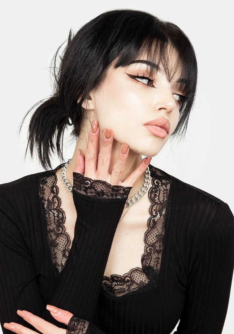 ❦ Black lace trim long sleeve bodycon dress