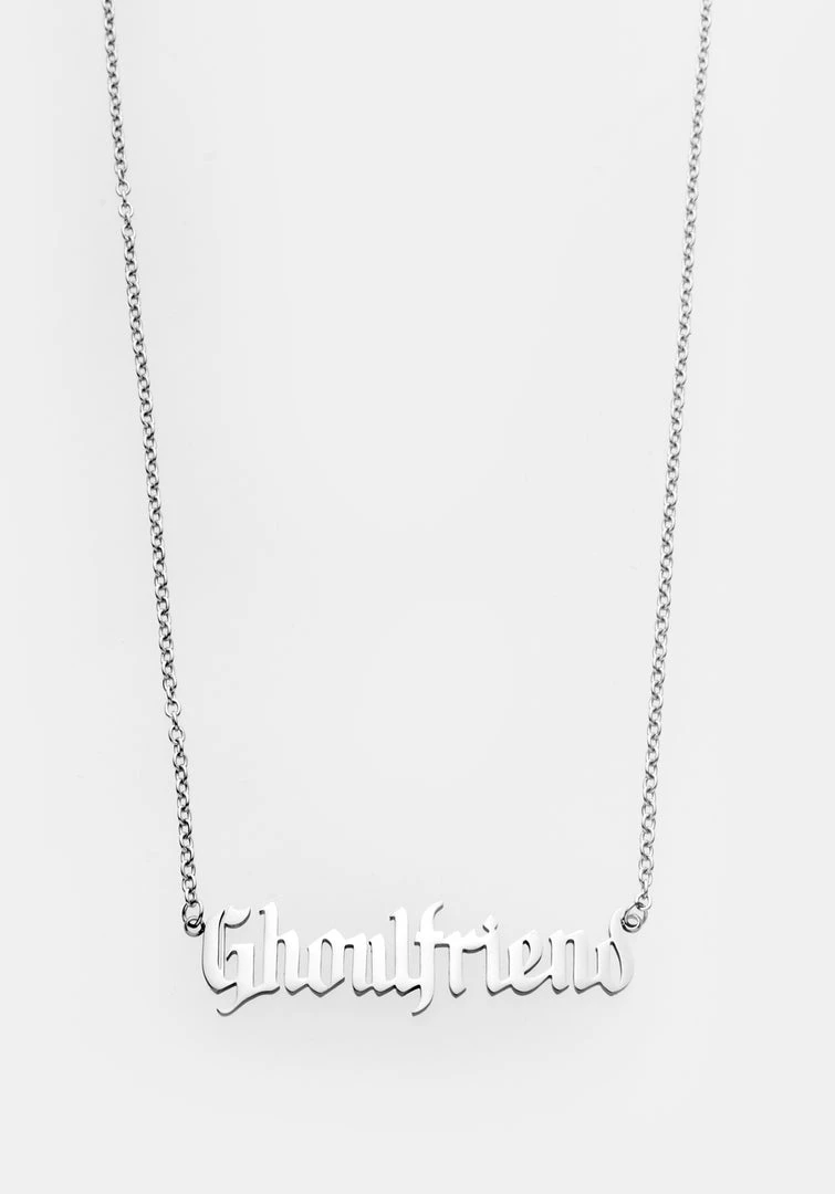 ❥ Bold gothic “Ghoulfriend” script contrasts delicate chain links