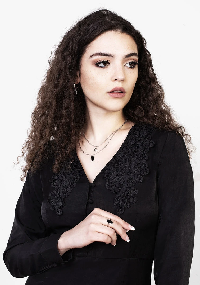 β¦ Button-down black mini dress with lace collar