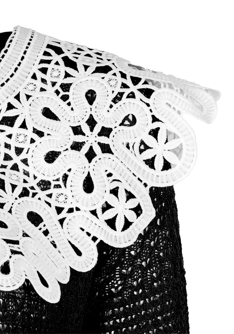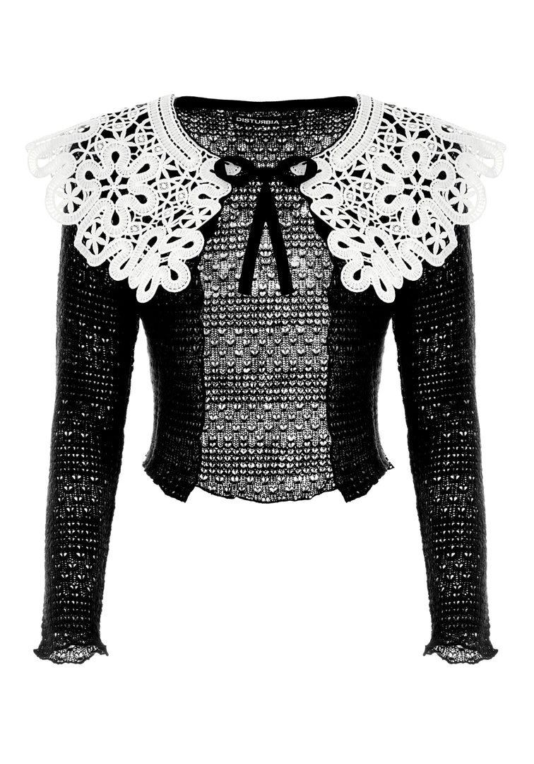 β¦ Black cardigan with white lace collar