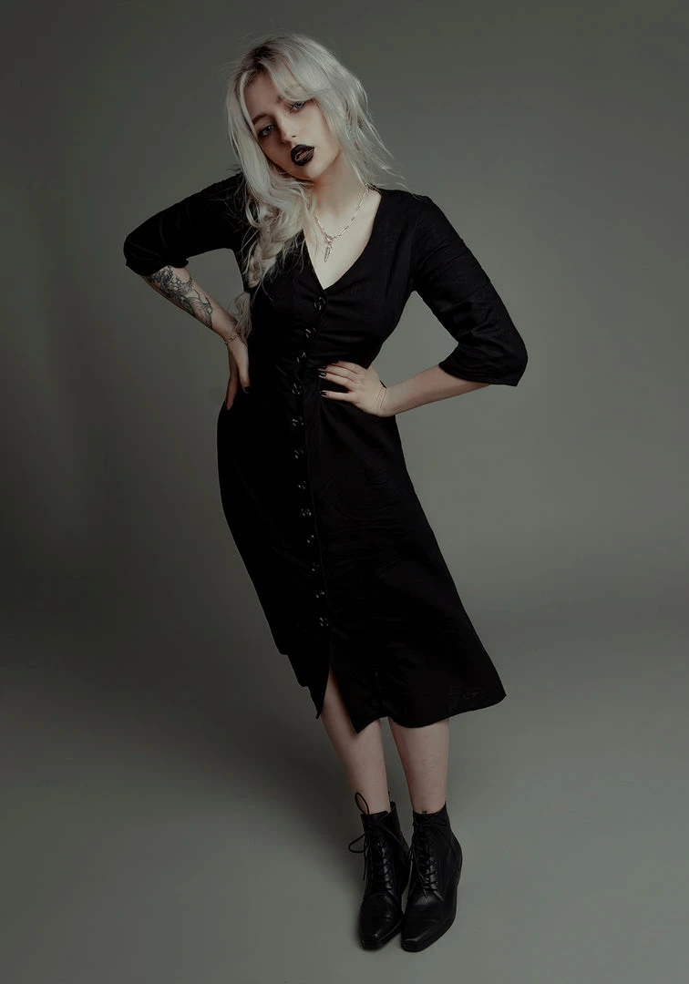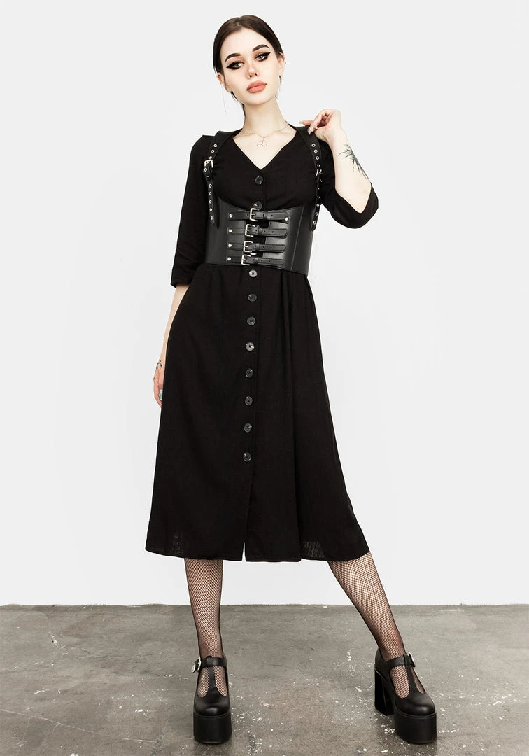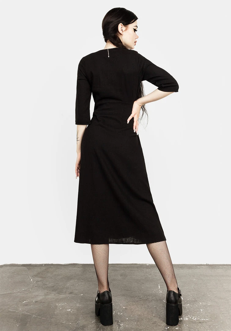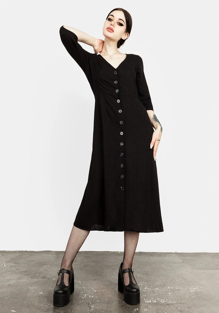 β₯Β Black button-up midi dress with flattering flute sleeves