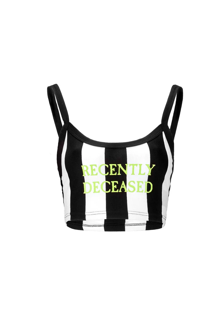 β§ Lime-green slogan print reads ‘RECENTLY DECEASED’
