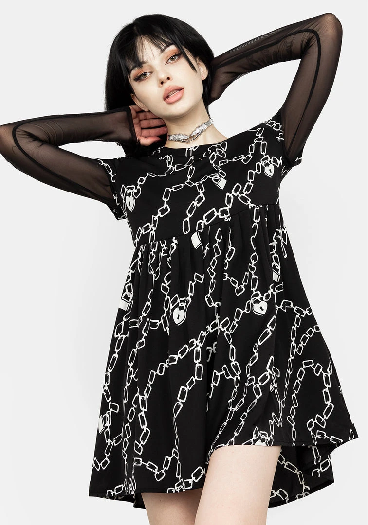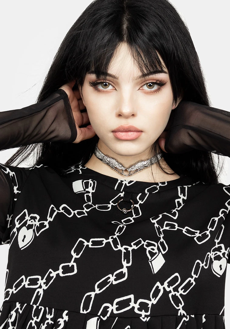β¦ Black breathable fabric with white love-lock & chain all-over print