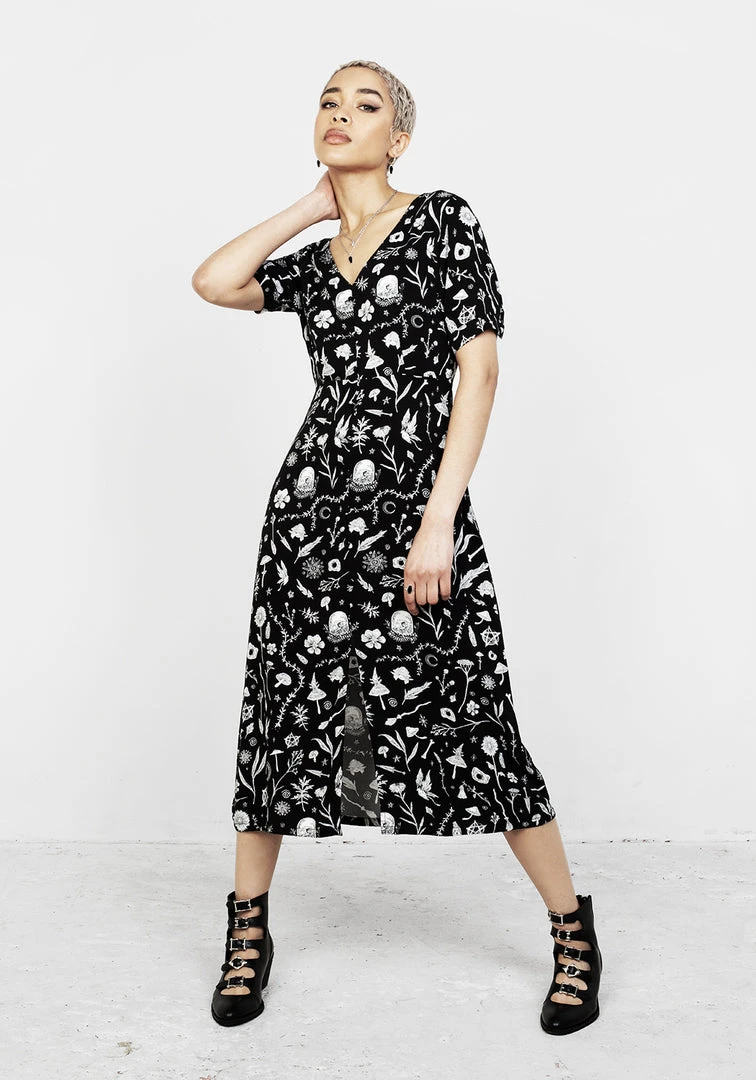 ☽ Black V-neck midi dress with front slit and fabric-matched buttons