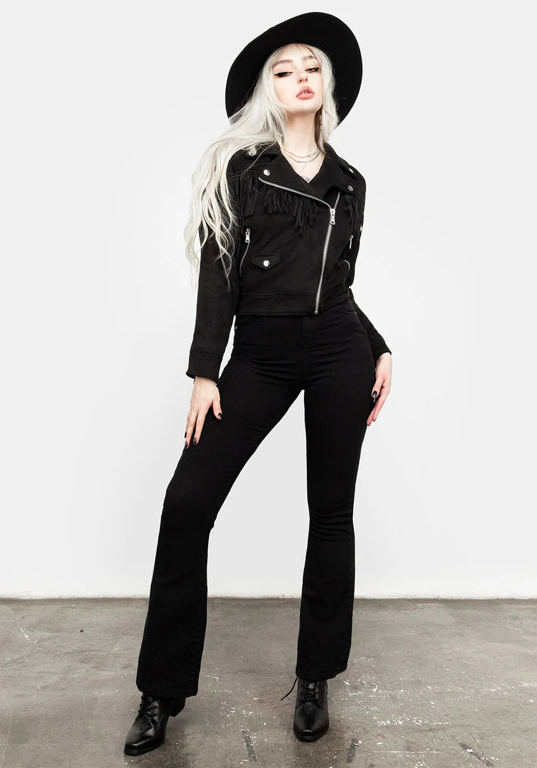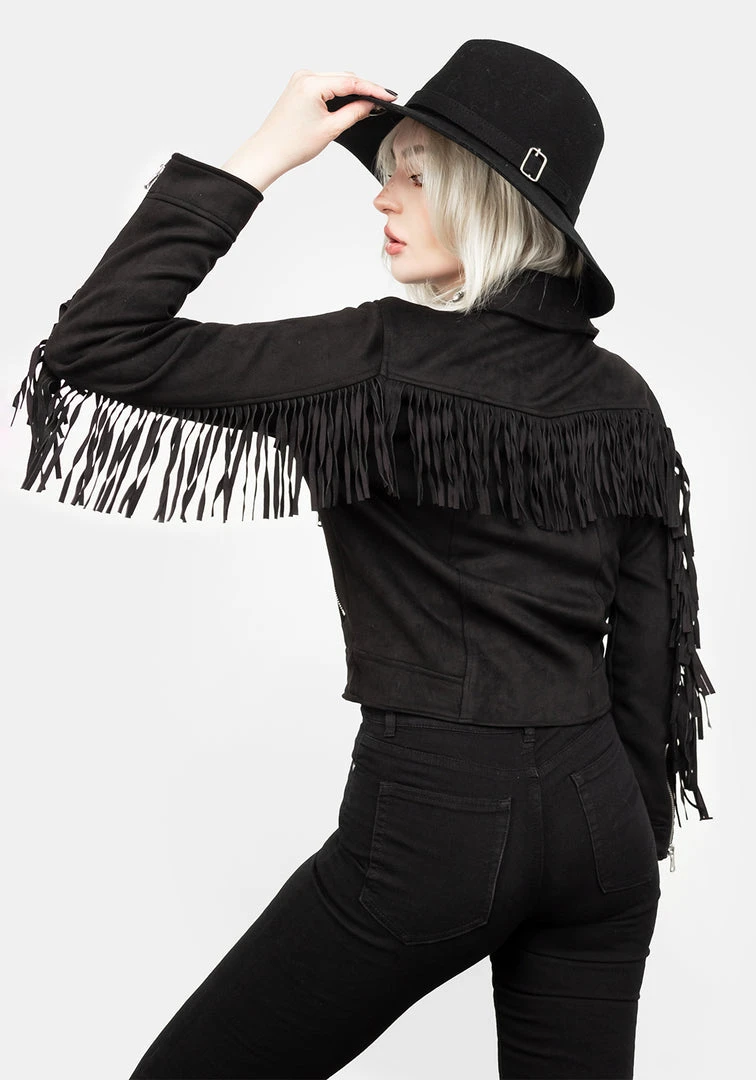 β¦ Black faux suede fringed jacket