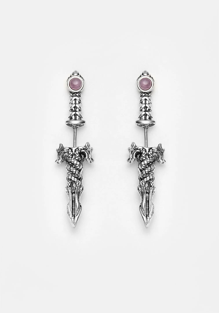Not for the faint of heart, Ritual Split Earrings give the appearance of a dagger through your lobe. It doesn’t get bolder than that! Embrace the chaos in all its detailed beauty, with a delicate semi-precious amethyst and finely engraved dragons adorning the soft blade. Another round-cut amethyst is mounted into the handle, said to heighten intuition, healing and meditative state.