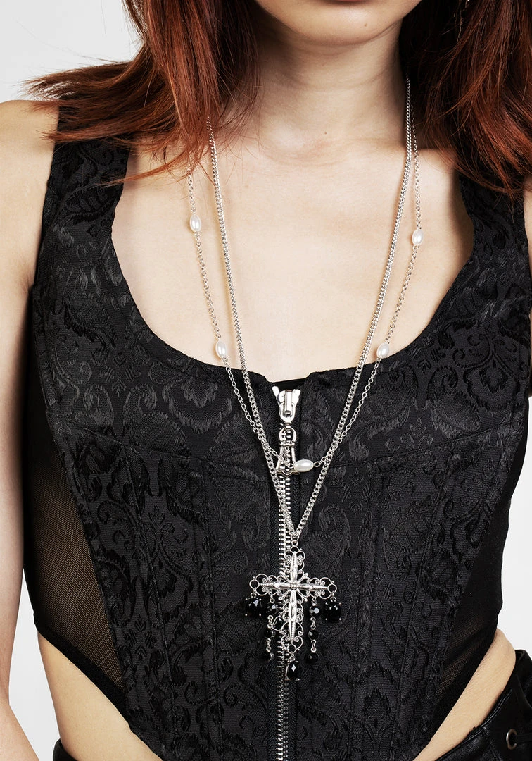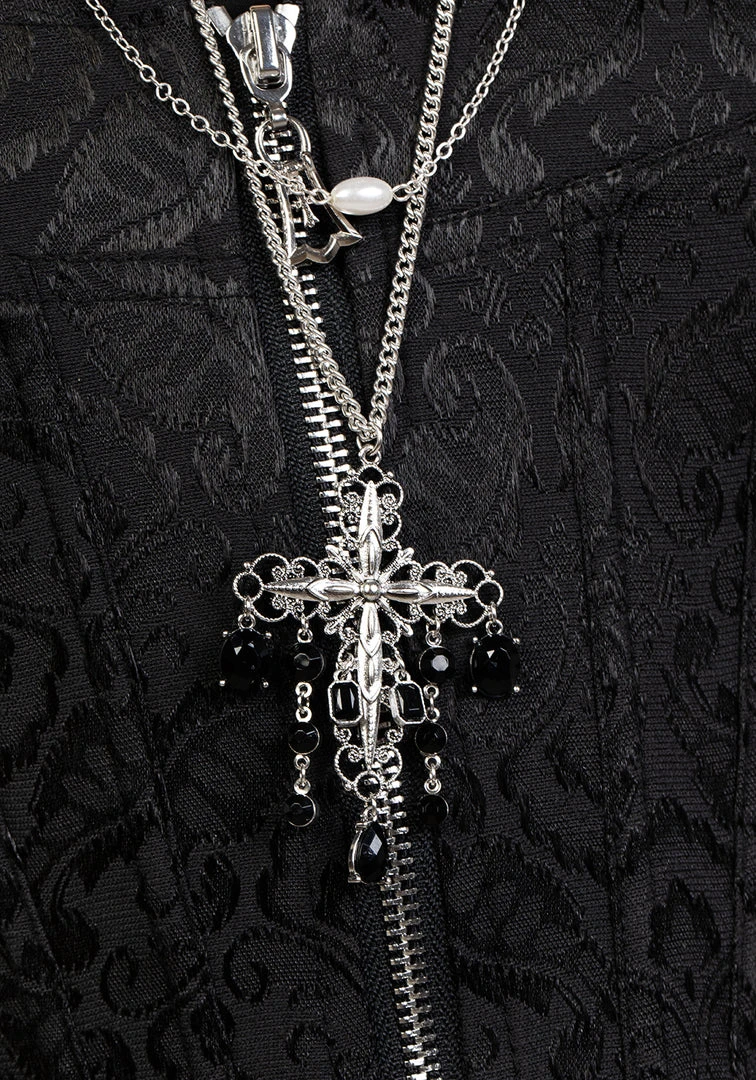 There’s more to this world than a simple dichotomy of heaven and hell: explore the very nature of being with this duo-chain opera length necklace. A faux pearl matinee chain adds sparkle to the decolletage, while the intricately ornate cross charm (literally dripping in black faceted gems) hangs from the longer flat curb chain.